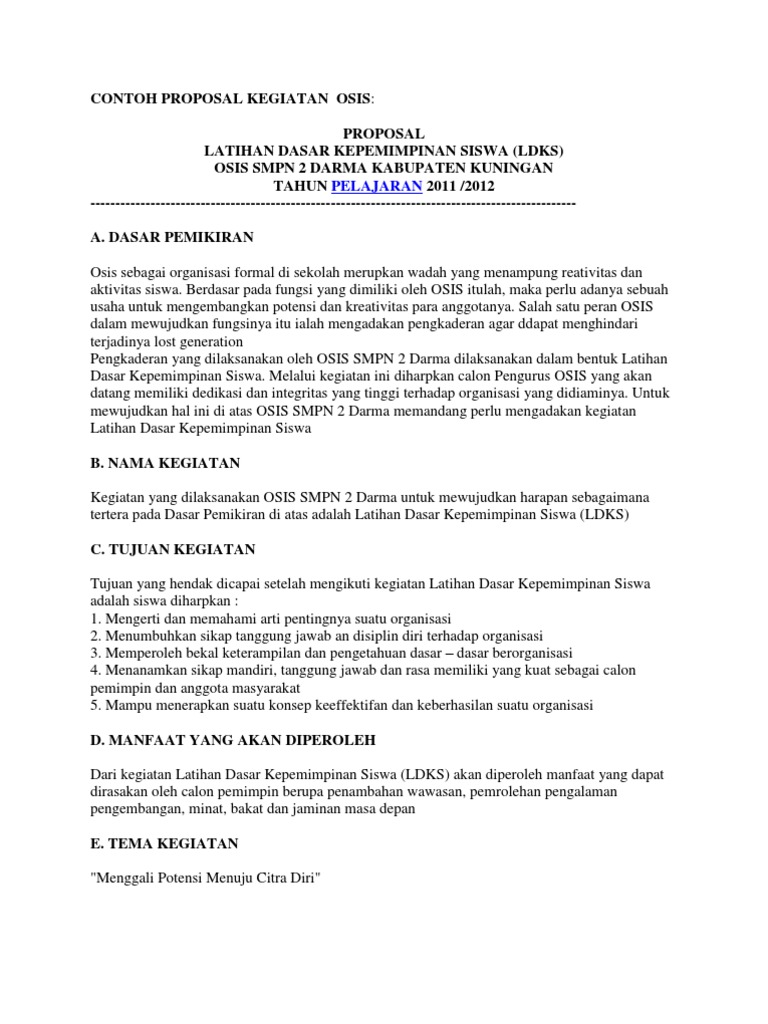 Contoh proposal kegiatan seleksi pengurus osis baru. Untuk melihat proposal kegiatan ldks. Latihan dasar kepemimpinan siswa (ldks) osis smpn 2 darma kabupaten kuningan Maka dengan ini kami atas nama panitia ldks dan musi bermaksud untuk mengajukan permohonan bantuan dana sebesar rp. Contoh proposal dapat membantu seseorang ketika hendak membuatnya.