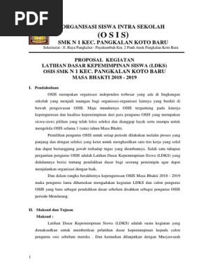 Untuk file contoh proposal berikut kami lampirkan pada link yang kami sertakan dibawah artikel ini , sedangkan untuk uraian ulasan nya berikut silahkan disimak. Proposal kegiatan latihan dasar kepemimpinan (ldk) organisasi siswa intra sekolah (osis) smp daarul. Home » kegiatan osis ma nurussyahid » contoh model proposal kegiatan (ldks) latihan dasar kepemimpinan siswa di ma nurussyahid kertajati tahun 2019. Berdasar pada fungsi yang dimiliki oleh osis itulah, maka. Dalam kesempatan kali ini saya akan bagikan sebuah proposal yang bertemakan kegiatan sekolah dengan judul ldks (latihan dasar kepemimpinan siswa) dilingkungan satuan pendidikan.